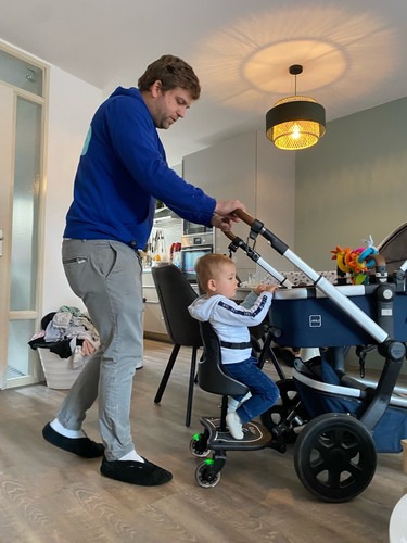 - Kidsriver universeel meerijdplankje met zitting. Hier zijn we uiteindelijk voor gegaan. Je maakt 2 bandjes vast aan het frame van de wandelwagen (die blijven zitten), je kunt het plankje er makkelijk op en af klikken. Het zitgedeelte kan er met 1 klik af, dan kun je het plankje met een bandje ophangen als je hem niet gebruikt. Hij steekt wel wat verder uit dan het joolz plankje, maar veel minder ver dan de kidsit. De 2 wieltjes zitten vrij ver uit elkaar, dus je kunt er net ‘tussen lopen’. Wat betreft de rem, is het vergelijkbaar met de sokfoto van hieronder 😜 Nog geen lange afstanden gewandeld, maar het lijkt een goede aankoop!
