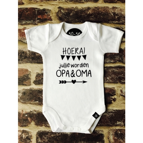 Wij zullen het met kerst bekend maken. Voor onze ouders een grote cadeau box met daarin een slab of romper met opa en oma erop..