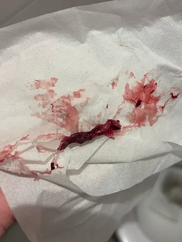 Stolsels vallen in water grotendeels uit elkaar en een vruchtje niet. Maar het kan normaal zijn rond die tijd wat bloed te verliezen. Verlies je nog steeds veel bloed ? Mijn ervaring met een miskraam is dat het echt enorm veel bloedverlies gaf. Ik hoop dat je snel duidelijkheid hebt. Sterkte😘