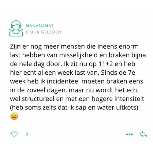 Ik ben 15w+1 dag en vanaf week 7 enorm misselijk met vrijwel iedere dag braken en daarbij ook ontzettende hoofdpijn. Helaas is het bij mij nog niet verminderd, zelfs niet met Emesafene. Het is zwaar, maar ik blijf hoop houden dat het minder zal gaan worden. Veel succes. Ik hoop dat het bij jou snel over is!