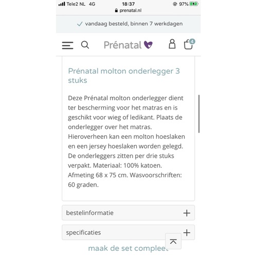Oh en een molton op wiegformaat en een molton p ledikant formaat, vannallebei dus één. Wel twee hoeslakentjes van elke maat.