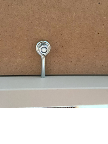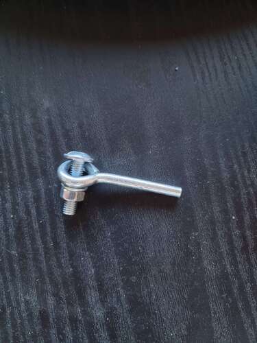 Ja die pinnetje met de oogje in de gaatjes in de hoekbalken. Die hoef je niet te schroeven. Daarop de inlegplaat en daar zitten in de hoeken voorgeboorde gaten. Daar doe je de bout doorheen