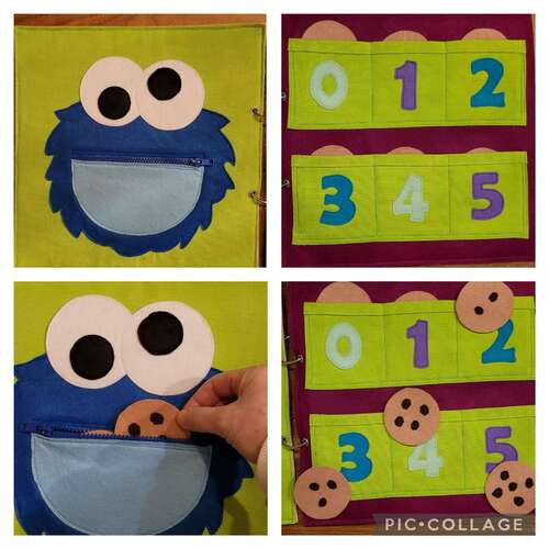Dan hebben we een pagina met koekiemonster en een pagina daarnaast met koekjes. Koekiemonster kan koekjes opeten door zijn mond open te maken met een rits. De koekjes hebben verschillende aantallen chocolate chips om te oefenen met tellen.