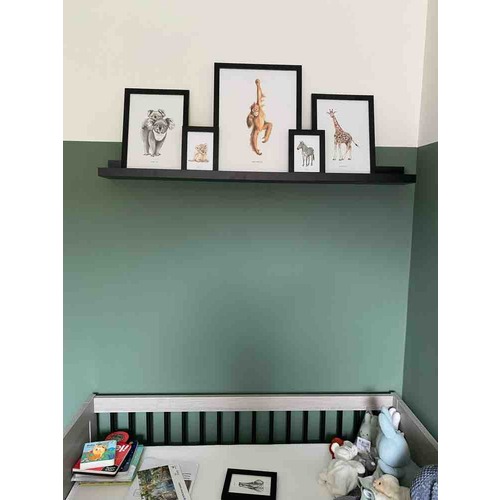 Plank van Ikea met dierenposters in lijst. Wil de kleine ineens F1 of voetbal posters is het zo gewisseld :)