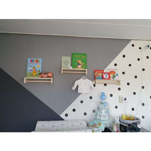 Wij hebben boven de commode een even grote spiegel hangen. Onze baby vindt het fantastisch om in de spiegel te kijken en gek te doen dus een hit hier! Ook afleiding tijdens het verschonen. Boven de spiegel hebben we een even grote plank met een lamp en mandjes voor luiers, medicijnen zalfjes etc, knuffel en een rotan lamp wat een leuk effect geeft op de muur. We hebben nog een plankje op een andere muur met boekjes. Bij het ledikant hebben we lijstjes met dierenposters in kinderstijl