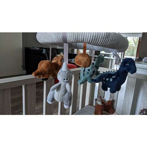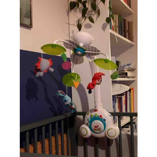 Tiny love into the forest! Geluid kan zachter en uit, zitten verschillende muziekjes op, is niet heel erg lelijk. De poppetjes draaien rond en “vallen” Gekocht toen ons zoontje 1 maand was oid, nu 6 maanden en nog steeds fan!
