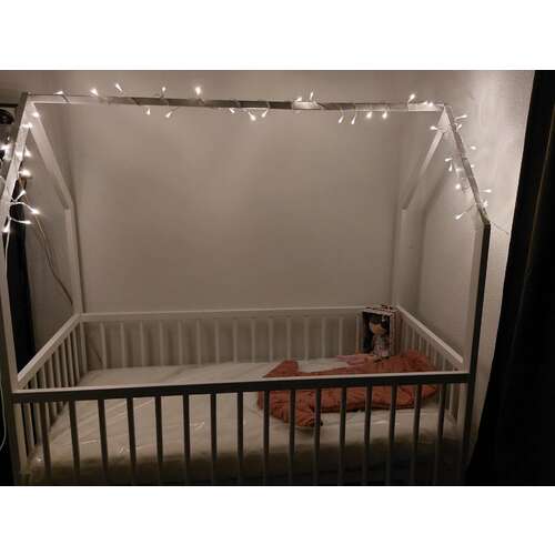 Ik heb gewoon kerstlampjes op baterije om het bedje en dat licht wat afgeeft is met alleen dat aan dus dat gebruiken wij. 2 euro klaar🤣