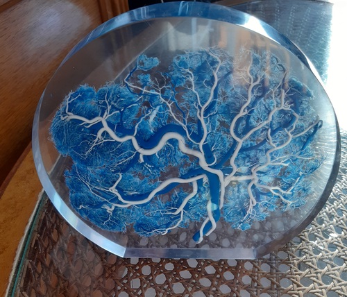 Het eindresultaat bevat geen weefsel meer. Dat is volledig verwijderd. Wat erover blijft zijn de harsen die in de placenta ingespoten werden in de bloedbanen ervan. Na uitharding van de harsen is het weefsel/vlees verwijderd en krijg je de vorm van de bloedbanen in het uigeharde hars te zien. Dat wordt dan vervolgens in epoxy gegoten, het transparante wat je er rondom heen ziet.