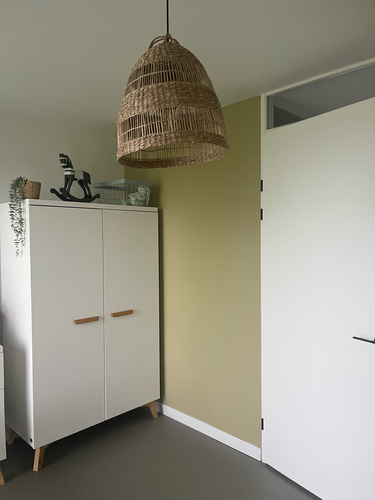 Wij hebben 2 aangrenzende muren in de kleur Brazilië S 1080 Y20R. De andere muren wit. Grijze gordijnen van boven tot onder en muurbreed (muur met ramen zelf is wit).