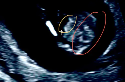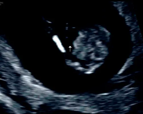 Mij lijkt het in ieder geval geen geslacht want dan zou je meer been moeten zien denk ik. Dan eerder de navelstreng maar vind de organen niet duidelijk dan weer dat het om de buik gaat en niet mooi rond genoeg.