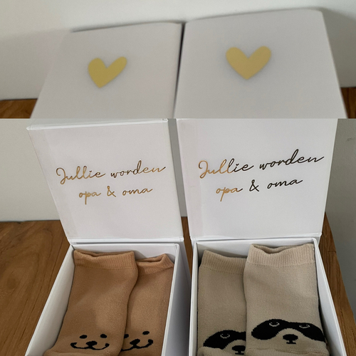 Wij hebben zulke doosjes gegeven aan onze ouders, de buitenkant stond gewoon dat hartje op en als je hem open maakte stond er in: jullie worden opa en oma, met dus de baby sokjes😊