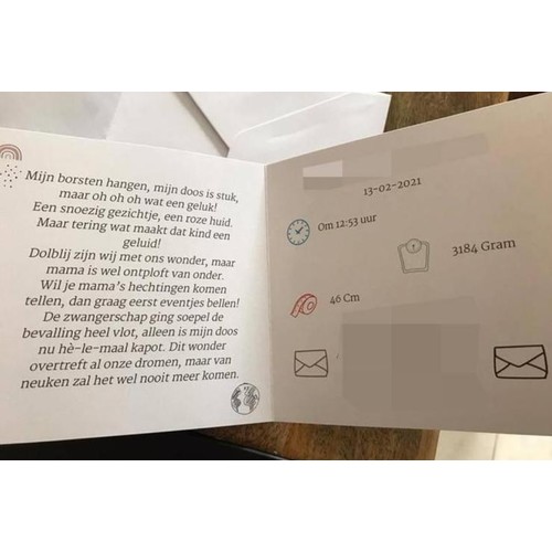 Bij wijgeboorte kaarten bestellen. Zelf de hele kaart ontworpen, ook daar etiketten besteld met alle adressen erop. Voor de geboorte alle enveloppen met adressen erop in orde gemaakt en na de geboorte hoefde ik alleen maar zijn gewicht geboortedatum/tijdstip en lengte erin de verwerken.