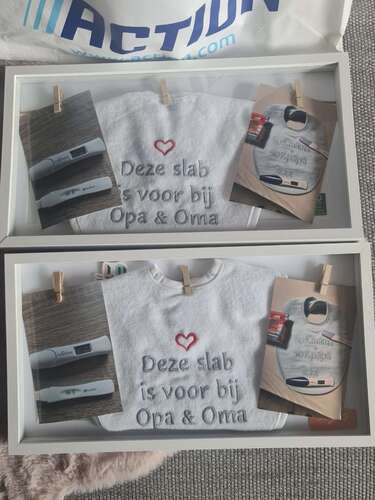 Bij de tweede hebben we weer een fotolijstje gedaan maar dan met een foto waarop grote broer het aankondigt en hetzelfde gedichtje iets aangepast.