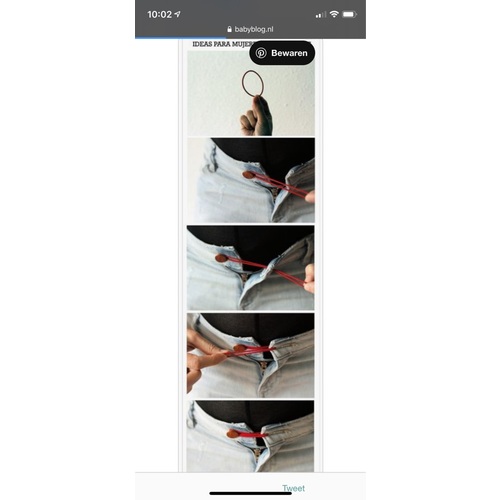 ‘Je kunt heel eenvoudig je broek aanhouden terwijl je al een buikje begint te krijgen met dit handigheidje. Doe een (haar)elastiek om je knoop, daarna door je knoopsgat en daarna weer om je knoop. Op het plaatje hieronder wordt het duidelijk uitgelegd. Doe hieroverheen een tuniekje of een buikband en je kunt er weer even tegenaan!’