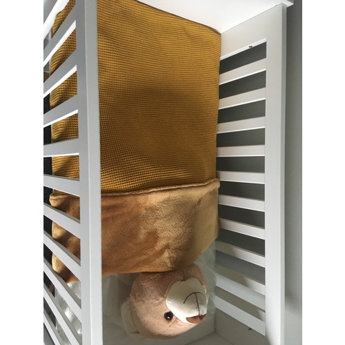 Verder voor in een relatief koude kamer, een laken en een goed dekentje, tog 2,3 tot 3, die kort is opgemaakt, zodat het kindje wederom niet met zn hoofdje onder de deken kan komen.