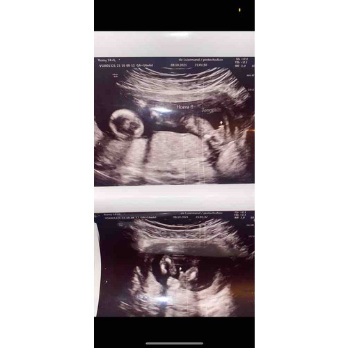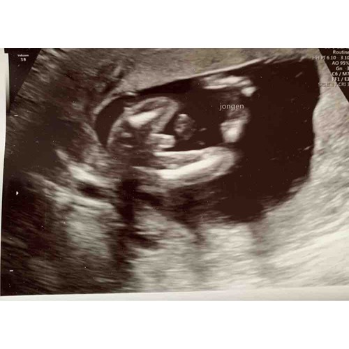 Je ziet op de onderste twee bovenbenen en een piemel. Ik vind het wel lastig te zien. Foto is nog ver weg. Dit was mijn echo met een jongen bij 16weken, misschien kan je het een beetje vergelijken met de onderste echo.