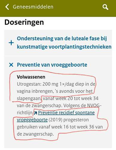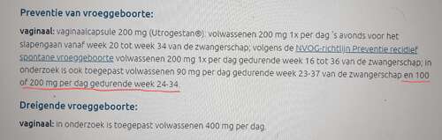 Ik gebruik ook vanaf 16 weken zwangerschap Utrogestan 200mg tegen vroeg geboorte ik heb twee premature zoons die met 9 en 6 weken te vroeg kwamen en nu 18 jaar later zwanger na ook twee x baarmoederhals kanker gehad te hebben ik mag maar tot 34 weken ze gebruiken ben nu 18,3 weken in mijn zwangerschap
