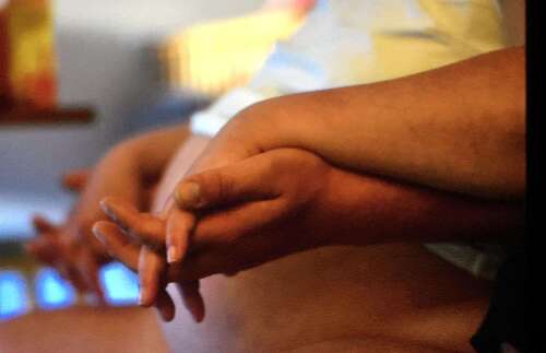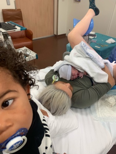 Thuisbevalling 02-06-2020. Ik op de baarkruk en mijn vriend op een stoel ac ...