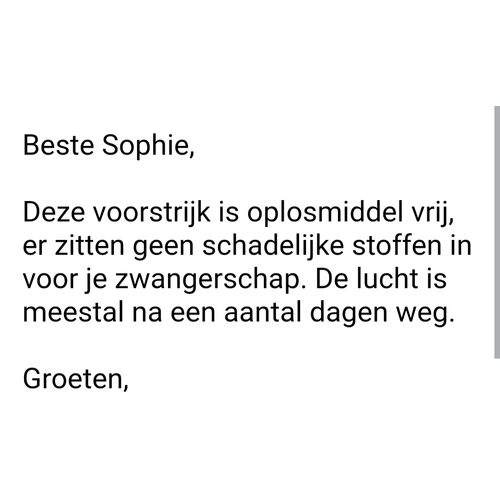 Ik heb me hier een aantal weken geleden ook zorgen om gemaakt. Zelf niet geholpen met aanbrengen, maar de lucht hing nog dagen in huis, omdanks permanent ventileren. Ik heb toen de klantenservice van Alablastine gemaild en geen zorgen: geen schadelijke stoffen voor jou of je kindje! :) Succes met de babykamer!
