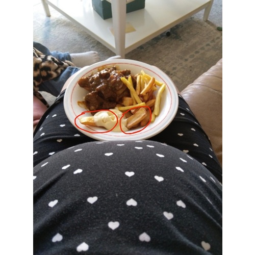 Ik voel me vooral schuldig dat ik afval ondanks dat ik mijn best doe om te eten. Zowel de gynaecoloog als verloskundige zeiden, liever lekker patat met een frikandel dan niks eten. Ook gewoon een beetje genieten van je eten hoor. Je kindje zal vast nog wel een keer vaker een patatje eten😏