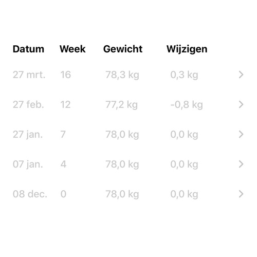Na 11 weken: 85,4 kg +0,8 kg