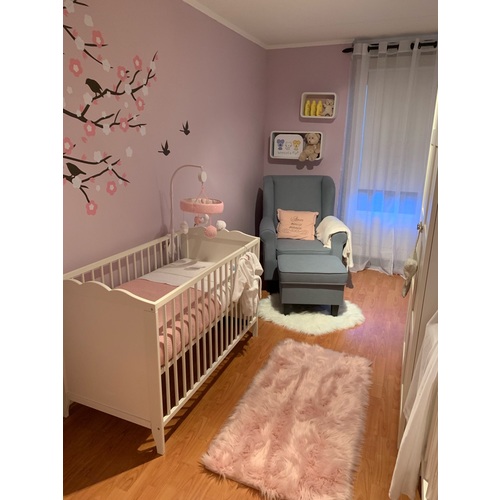 Onze babykamer was de logeerkamer. Daar stond een Ikea slaapbank en mijn wasrek. Het wasrek staat nu in een andere kamer, de slaapbank hebben we gehouden. Ik vond het erg fijn om haar daar 's nachts te voeden en nu ze al wat ouder is (ze wordt al bijna 2) is het een fijne plek om haar voor te lezen als ze gaat slapen. Dan zitten we heerlijk met zijn tweetjes op de bank, en als mijn vriend meegaat om haar naar bed te brengen past hij er zonder problemen bij.