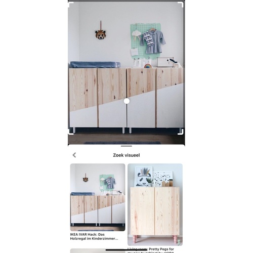 Wij hebben ook een klein kamertje. Ik heb voor deze Ivar kast gekozen en ook 2 naast elkaar ( foto is van Printerest). Hierdoor past een ledikant en een stoel voor de nachten.