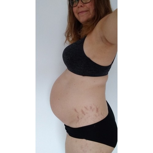 Eerlijk, ik heb striae alleen op m'n zij, m'n billen en de rest van m'n bovenbenen. Hier op deze foto zie je het begin. Vooral die op m'n benen vind ik vreselijk. Had ze liever op m'n buik gehad, dat is toch wat echt (hoort te groeien) groeit voor de baby. Ach, we doen er niks aan. Nog even in mentaal proces om deze nieuwe zebra-ik te omarmen!