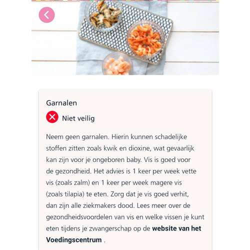 Ja dat is een afweging die je voor jezelf moet maken. Ik bedoel alleen te zeggen dat er wel een verschil zit in dingen die je echt moet vermijden (zoals rauw vlees of ei) en dingen die je alleen met mate mag (zoals leverworst, bepaalde kruiden of dus gebakken garnaal). Maar jij bepaalt waar je je prettig bij voelt