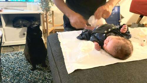 Na de geboorte en na het vertrek van de verloskundige en kraamverzorgsters kwam de andere kat beneden en zag hij onze dochter voor het eerst, ze werd toen toevallig net voor het eerst ooit verschoond (zie foto). Deze kat was in de kraamtijd verliefd op de kraamverzorgster en ze deden alles samen de hele week, waar de kraamverzorgster was, daar was hij. Dit was ook de kat die de hele zwangerschap bij m'n buik lag, dat deed die andere dan weer niet.