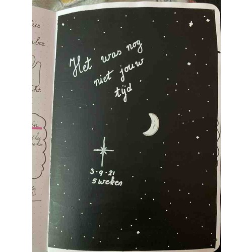 Ik was al begonnen met een zwangerschaps journal en heb daar een afscheidspagina gemaakt. Ik ben in ditzelfde journal verder gegaan met mijn nieuw zwangerschap. De eerste zal altijd onderdeel blijven van mij en mag zo wel herinnerd worden.
