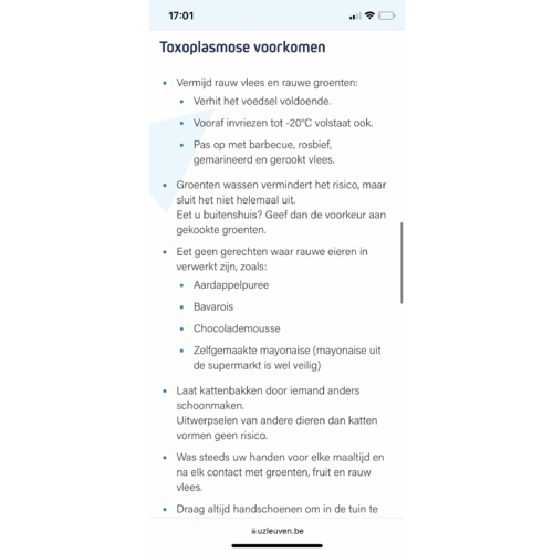 Nee niks over toxoplasmose nee. Maar het is niet dat we per voedingsmiddel echt de risico’s hebben besproken, dat niet. Maar ik dacht ook salmonella en listeria.