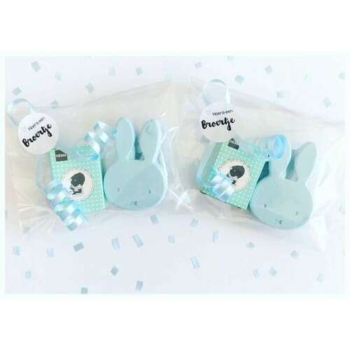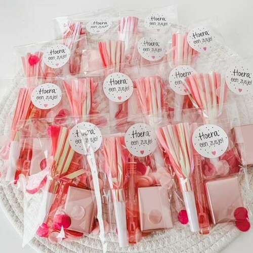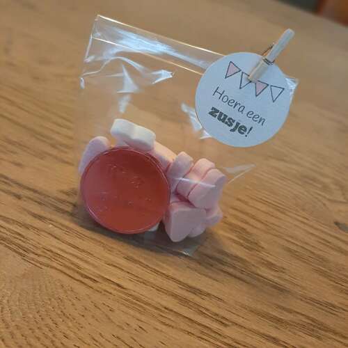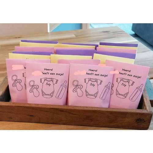 Hier uitdeelzakjes gevouwen. Er zit een geboortekoekje en een koetjesreep in.