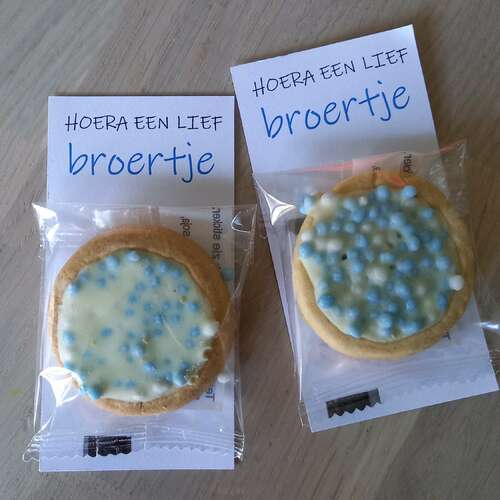 Deze kreeg ik toevallig vandeweek op kdv. Op achterkant staat hoera broertje ... van .. is geboren