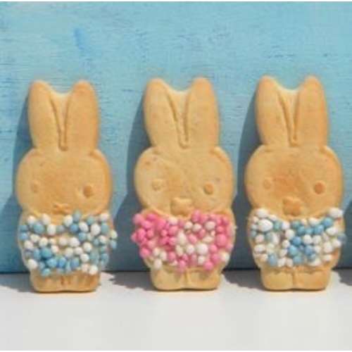 Is met witte chocolade pasta en muisjes. De Nijntjes zijn van bolletje (nijntje dreumesbiscuit) en te koop bij supermarkten (althans volgens internet, zelf nog niet gecheckt)