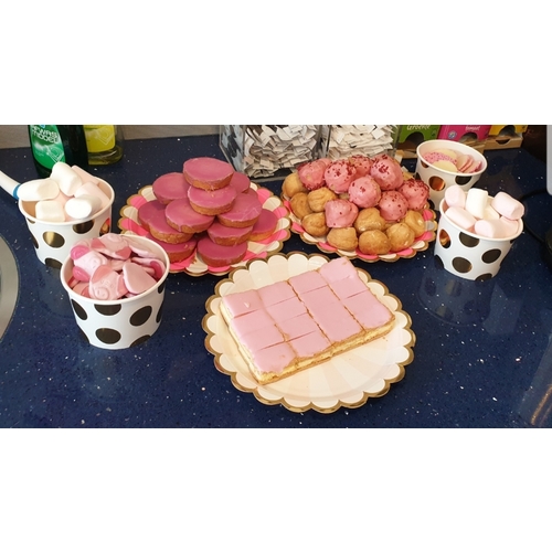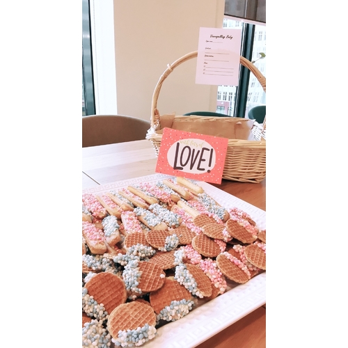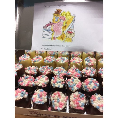 Omdat we een meisje gekregen, had ik in ieder geval mini roze tompouce en roze koek. En ik had nog een sluitbare pot gevuld met allemaal roze snoepjes, zoals roze fruitella en roze biggetjes.