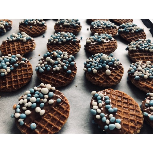 Was trouwens wel ff een werkje. (Witte) chocola smelten en dan koekje erin dopen, dan in de muisjes. Ik had de koekjes in een bak in de koelkast staan, anders stolde de chocola niet snel genoeg haha. Maar verder echt mega mee gescoord op kantoor 💪🏼