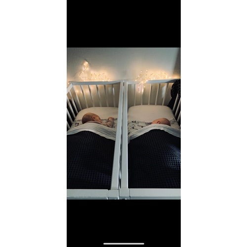 Jaaa deze wieg hebben wij ook! Top ding. Ze liggen er allebei zo fijn in, toch naast elkaar maar wel veilig door het ‘tussenschot’. De bedjes zijn ook vrij groot. Ze zijn nu 5 maanden en liggen er nog steeds ruim in, terwijl oudste zoon met 3 maanden toch echt uit zijn wieg was gegroeid. Je kunt de wieg eventueel ook op marktplaats kopen, daar komen ze regelmatig voorbij.
