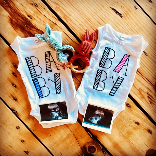 Wij dit gedeeld. We hebben twee rompertjes gemaakt. Het meisje is “Baby A” (want ze ligt het diepste) en het jongetje “Baby B” zoals de artsen het zeggen dan.