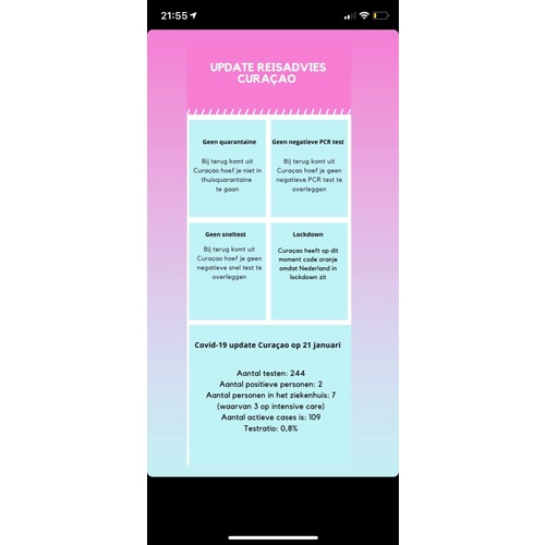 Ik ben in november op Curacao geweest en het was heerlijk. Eerlijk gezegd het gevoel dat je daar veiliger bent dan hier... je bent alleen maar buiten. Het aantal besmettingen is daar momenteel ook heel laag. Deze update is van gister: