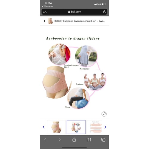 Ik heb er in m'n vorige zwangerschap wel wat aan gehad in m'n werk. Veel lopen en staan in de zorg, ik vond 't wel echt wat minder rugklachten geven. Maar het heeft niet voorkomen dat ik 'n stuk eerder de ziektewet in moest. Ik had hem wel alleen met werk om. Dat moest doorgaan. Ik wilde inderdaad niet dat m'n buikspieren zo slap zouden worden door de ondersteuning.