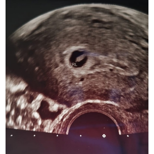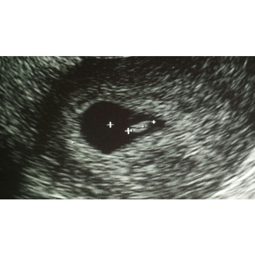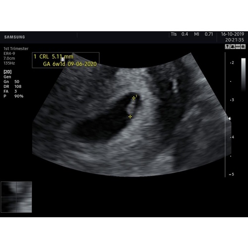 Ik had met 6+4 een echo. Hartje klopte nét. Je ziet een streepje. Meer niet ...