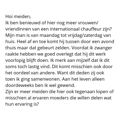 Ik heb er tot nu toe geen moeite mee. Tuurlijk zou het soms gewoon fijner zijn als hij thuis was. Juist omdat ik zoveel alleen ben met m'n zoontje zijn wij twee handen op 1 buik. Je moet je eigen plan trekken. Je moet je zelf staande houden op je eigen manier zoals jullie dat lukt. Mensen zullen het altijd beter weten en een oordeel hebben. Maar niemand doet het jou eventjes na. En als ik terug kijk op de afgelopen 3jaar kan ik zeggen dat ik het toch mooi flik en trot ben op mezelf.