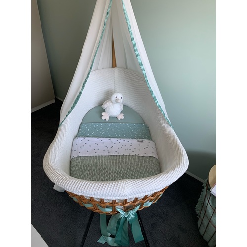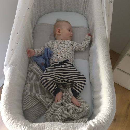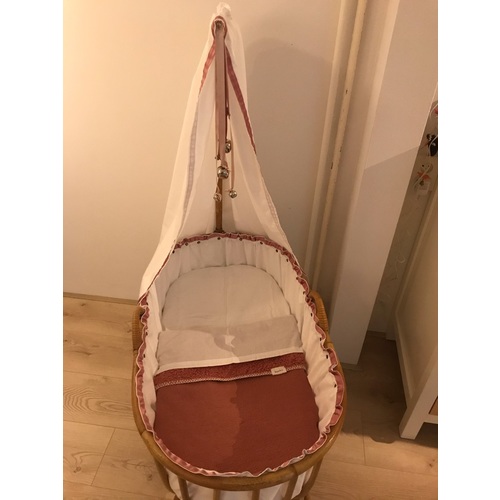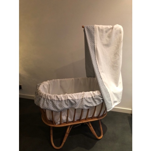 Wij hebben ook een familiewieg. Mijn schoonmoeder heeft hem helemaal gestoffeerd. Geen idee met wat voor een stof precies. Het lijkt op katoen. We hebben bij Babypark een matrasje op maat laten maken