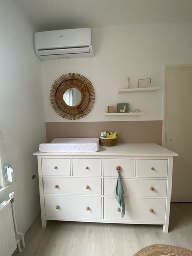 Ik heb er 2 wandplanken van de ikea hangen. Maar de onderste is ondertussen alweer leeg omdat mevrouw steeds gaat staan op de commode en alles er vanaf pakte.