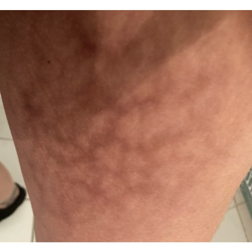 Mijn benen zien er zo uit als ik het heel erg koud heb en dan heet ga douchen. Misschien toch even een foto naar de huisarts sturen voor de zekerheid?