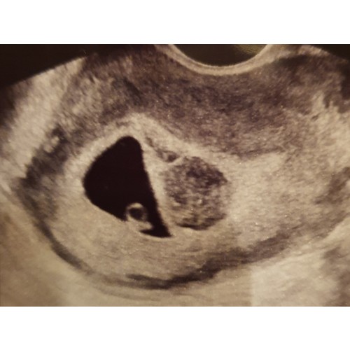 Ja vanmorgen om 9 uur! Vanmorgen thuis rood bloedverlies dus ik voelde m al aankomen maar we zagen een kloppend hartje! Grootte klopte ook precies met de termijn maar het bloedverlies zit me niet lekker. Pal naast de vruchtzak zit ook een ronde grijze vlek waarvan ze niet weet wat het is, kan een vleesboom zijn.. Vrijdag weer een echo🙏