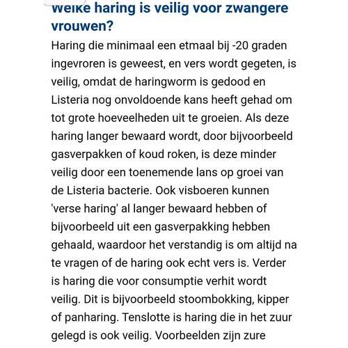 Ik dacht ook dat het mocht maar kwam er via dit forum laatst achter dat het niet mag. Zwangerhap is duidelijk: haring niet eten. Sindsdien eet ik ook niet meer! Natuurlijk gaat het 100 keer goed maar wil toch voorkomen dat ik bij de kleine groep zit waarbij het toch problemen geeft. Keuze genoeg aan alternatieven