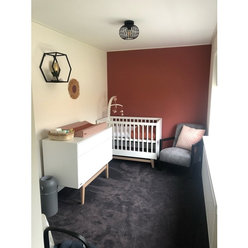 Geen speciale verf, maar gewoon gelaten zoals het was (wit/creme kleurgig) en witte meubels. In de aankleding grijs en roze gebruikt (gordijnen/verschoonkussen hoes/ dekentjes / knuffeltjes ect)