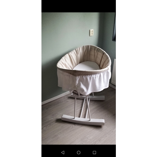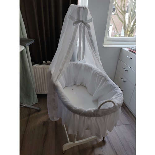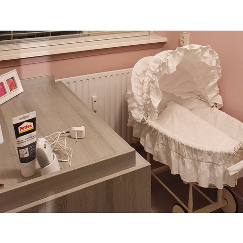 Wij hebben ook een familiewiegje, van mijn opa en oma geweest. Deze hebben we opnieuw bekleed. Hij is eerder al wit geverfd en er ligt een nieuw op maat gemaakt matrasje in.